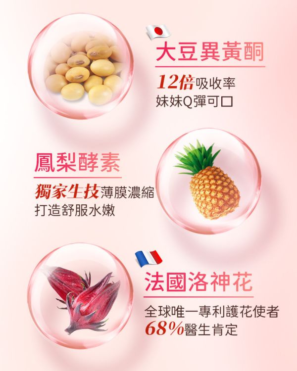 成分:蔗糖、蔓越莓萃取物、鳳梨果汁粉(鳳梨濃縮汁、麥芽糊精、檸檬酸、檸檬酸鈉、香料、蘋果酸、β-胡蘿蔔素)、大豆萃取物、N-乙醯基-葡萄糖胺、莓果發酵粉(玉米來源可溶性纖維、接骨木莓、野櫻梅、巴西梅、山桑子、黑醋栗、覆盆莓、黑莓、藍莓、波森莓、蔓越莓、楊梅、枸杞、草莓、桑葚)、洛神花萃取物、微結晶狀α-纖維素、玫瑰花瓣萃取物 、番石榴葉萃取物、聖潔莓萃取物、鳳梨萃取物(含鳳梨酵素)、蔗糖素(甜味劑)